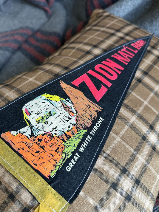 Utah Zion National Park Vintage Black Pennant on New Woven Plaid Throw Pillow