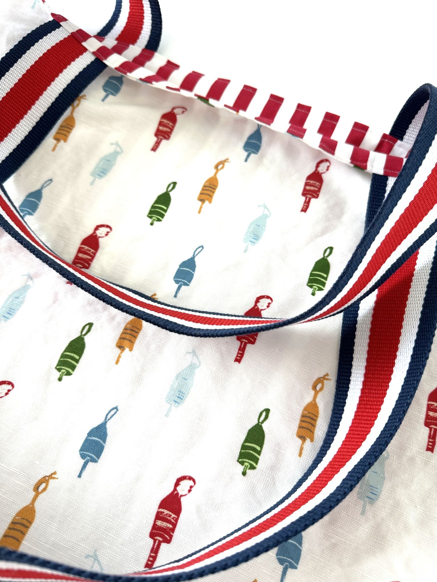 American Nautical Colorful Buoys Block Print Design Linen Tote Bag with Red, White, & Navy Blue Striped Straps
