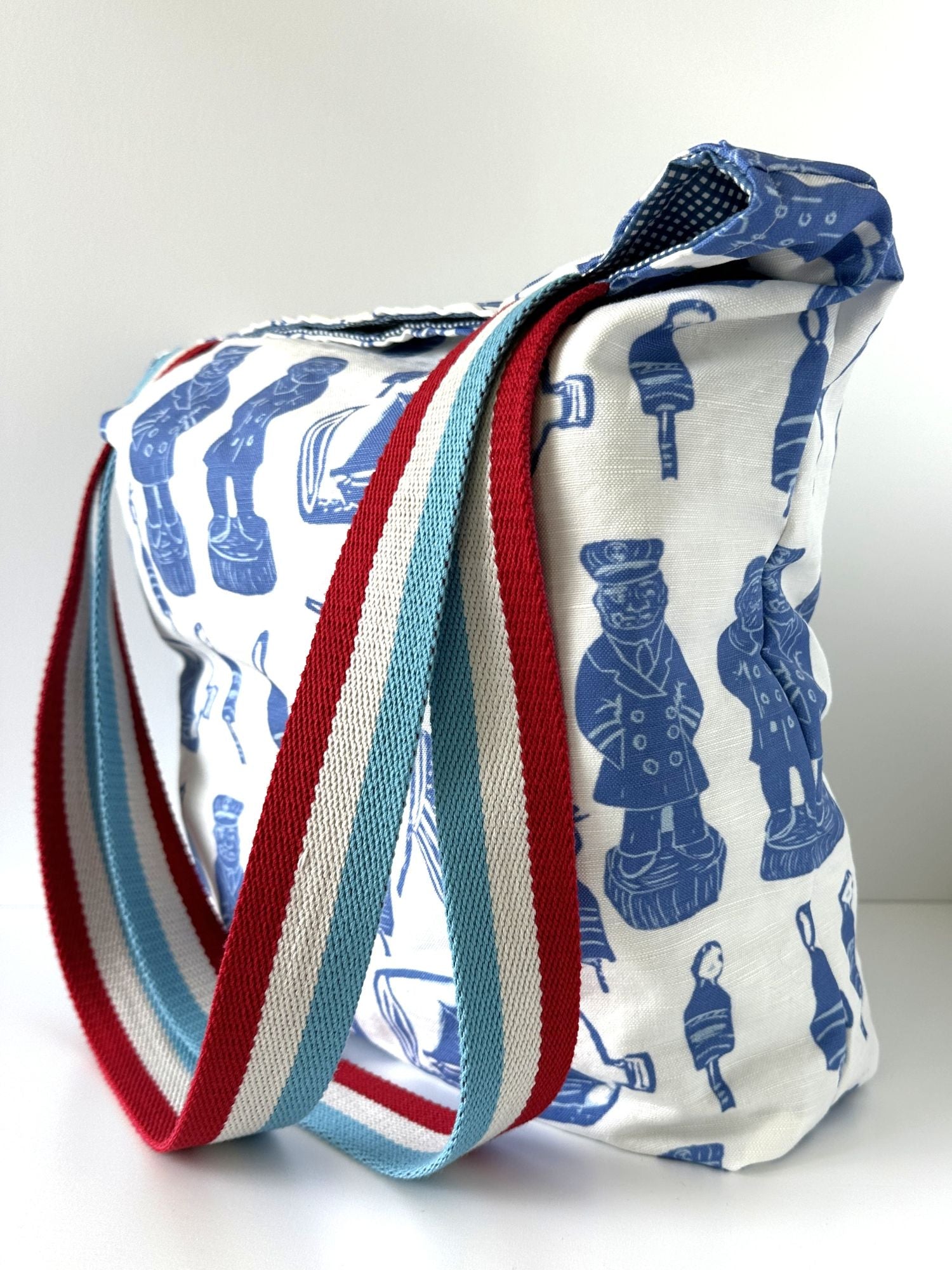 Nautical Old Salt, Buoys, Ship in a Bottle Block Print Art Fabric Design by Nikki Degn. These designs start as a drawing, then carved into a lino cut block. The hand carved block is used to create the image used in the design for this fabric. Sewn into this cute linen tote in my home studio.
