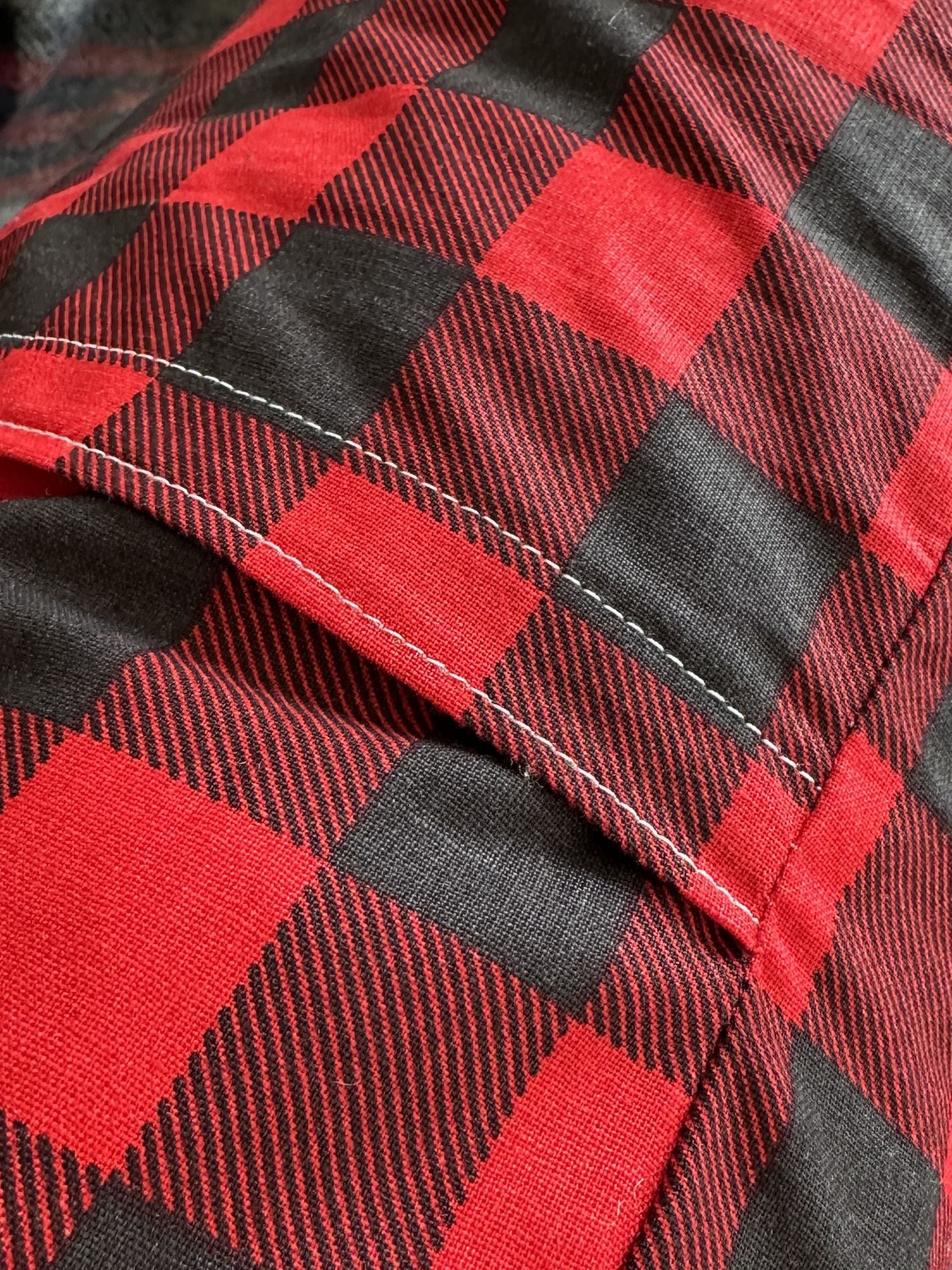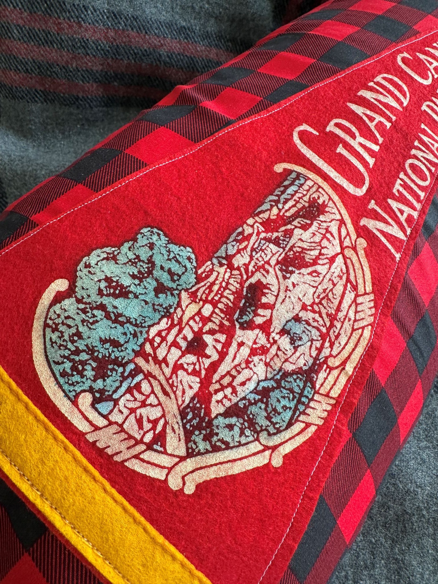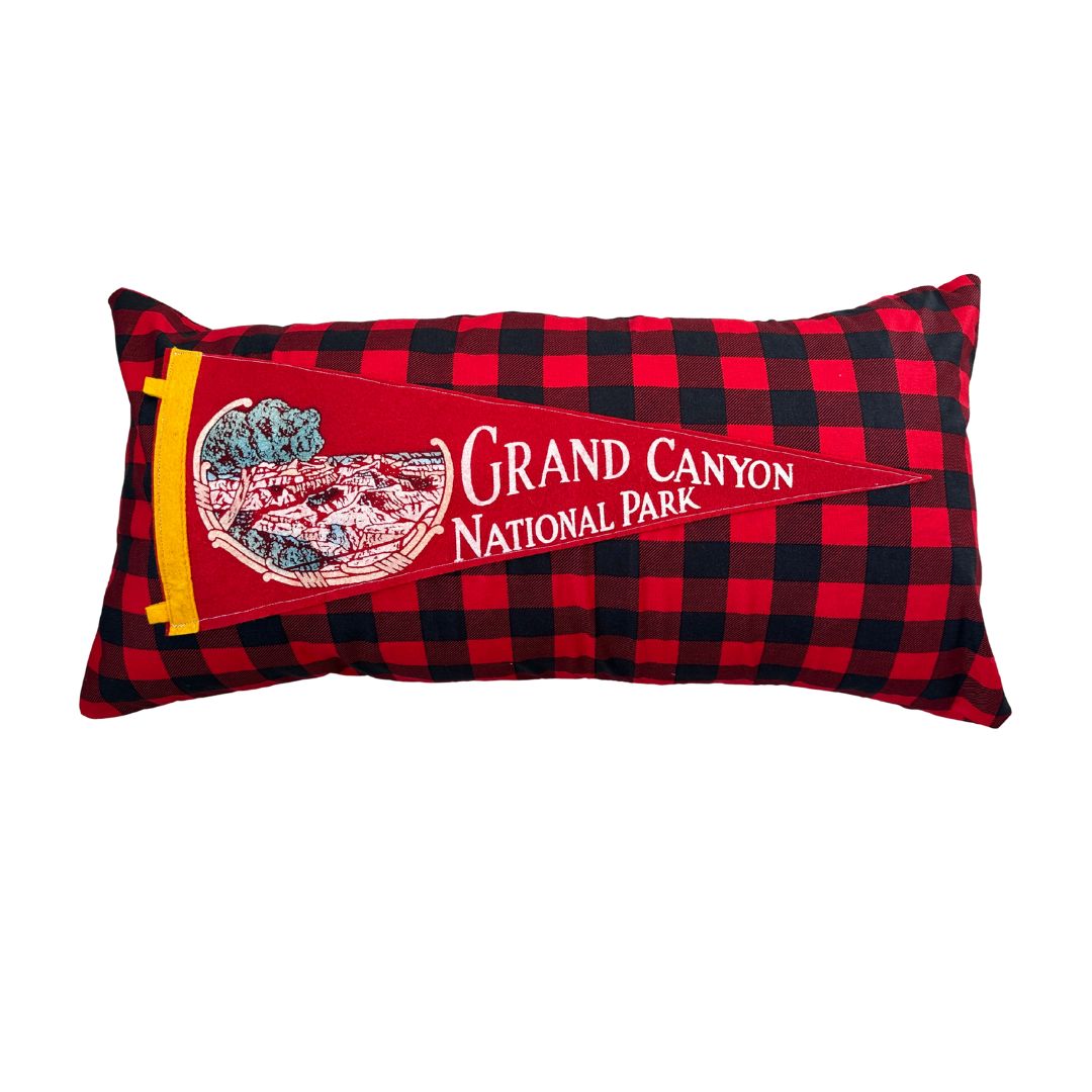 New red and black plaid woven cotton fabric used to create this throw pillow featuring a vintage Grand Canyon National Park large red pennant sewn in place.