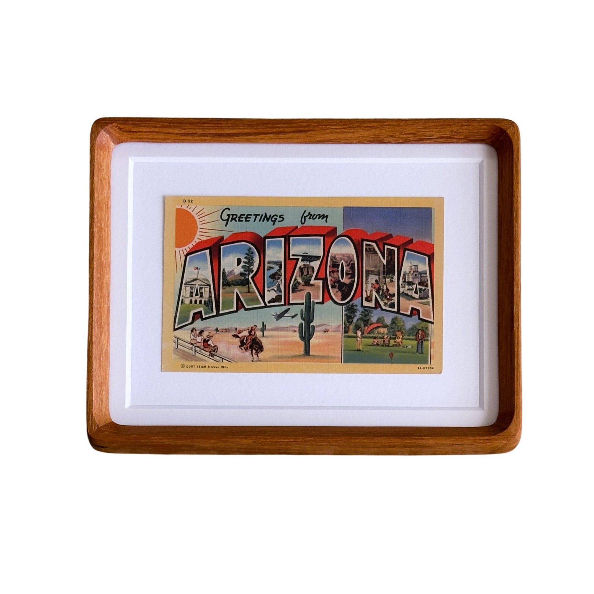 This Arizona vintage linen postcard measures approximately 3.5 x 5.5 inches, then framed in a solid teak wood 6 x 8 inch frame.