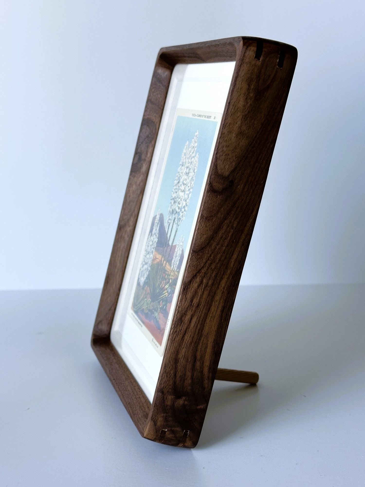 Natural Wood Solid Walnut Frame. Acrylic plexiglass with 6 x 8 inch opening. Overall Size 6.6 inches x 8.6 inches and 1.2 inches thick. Tabletop or wall mount.