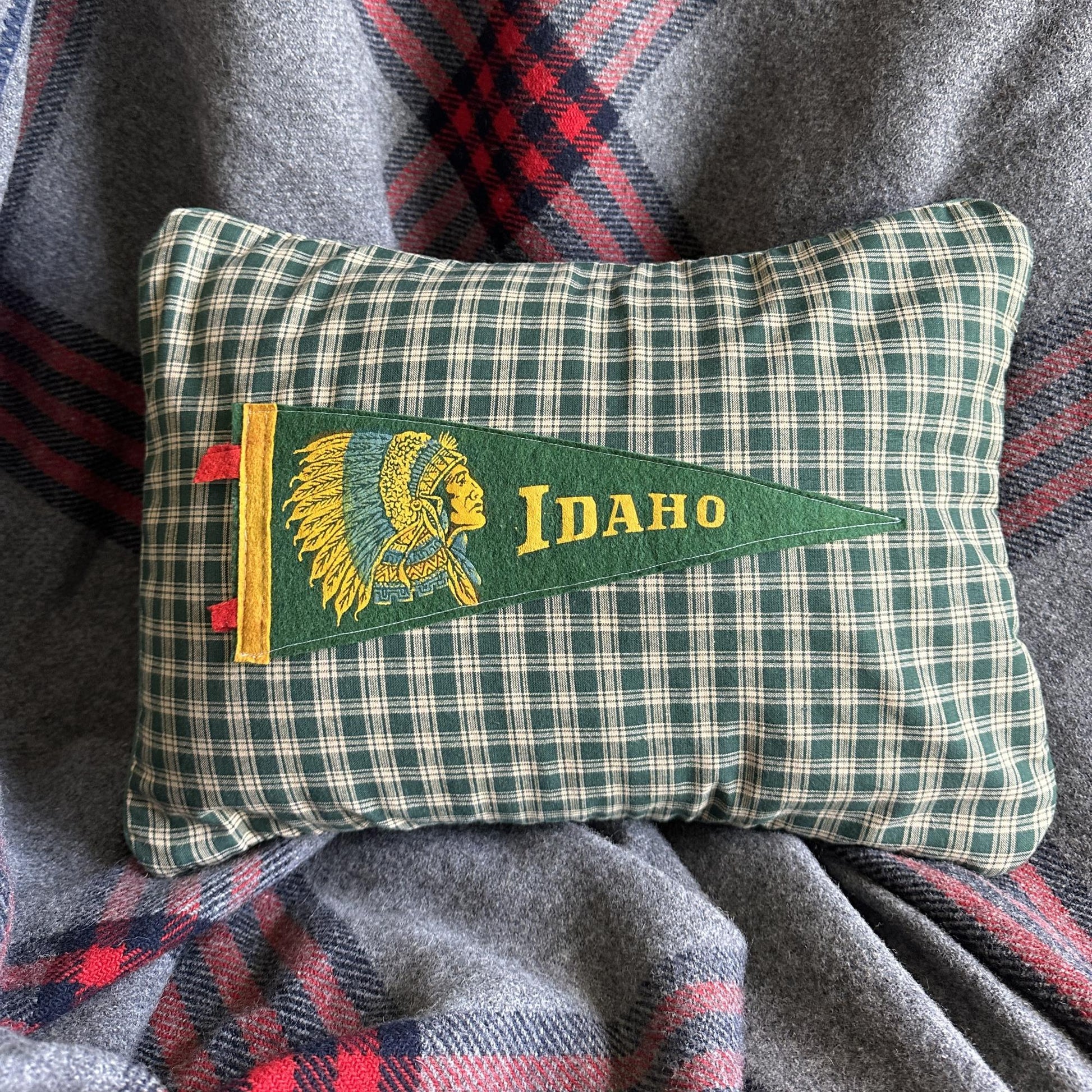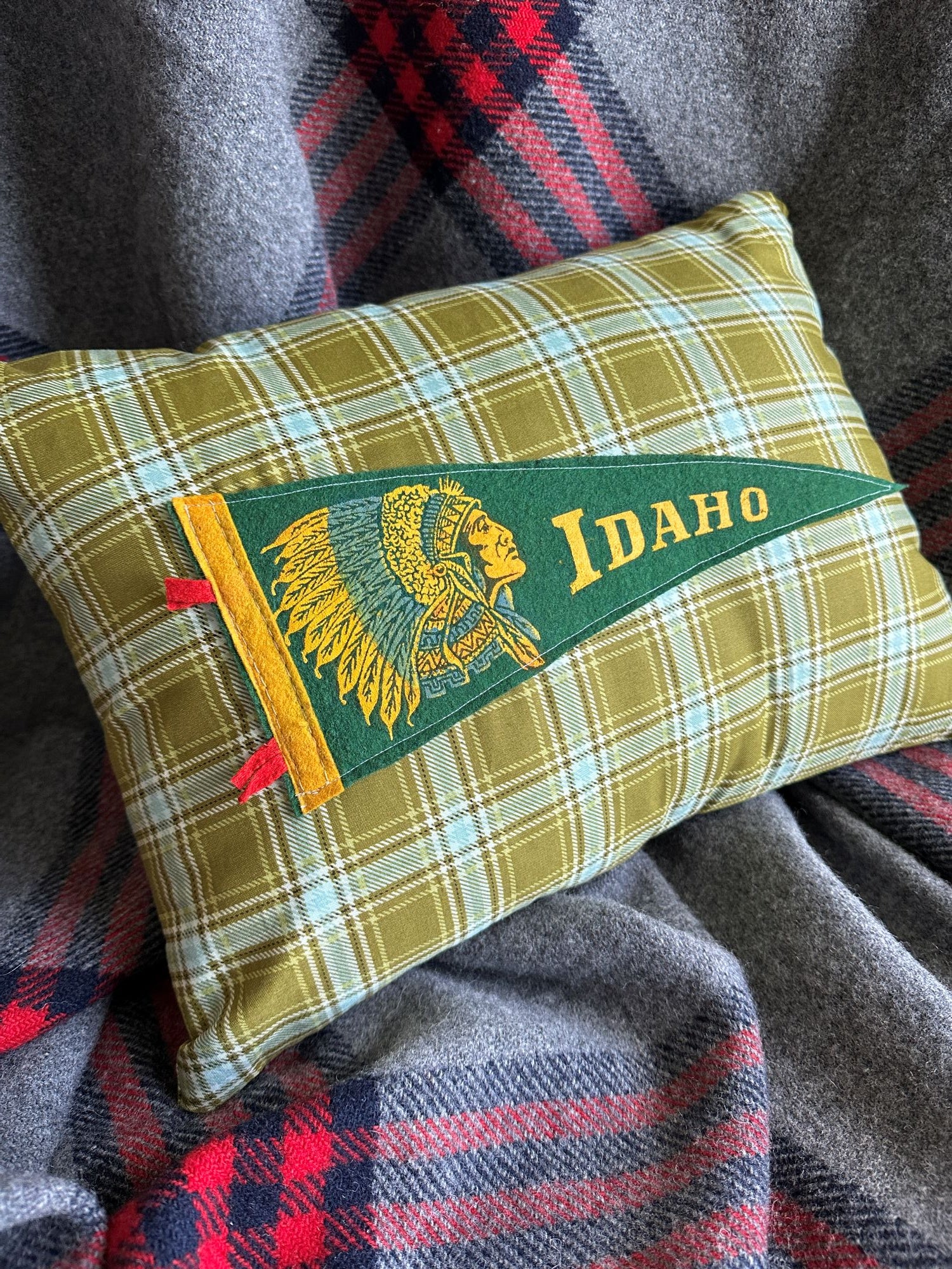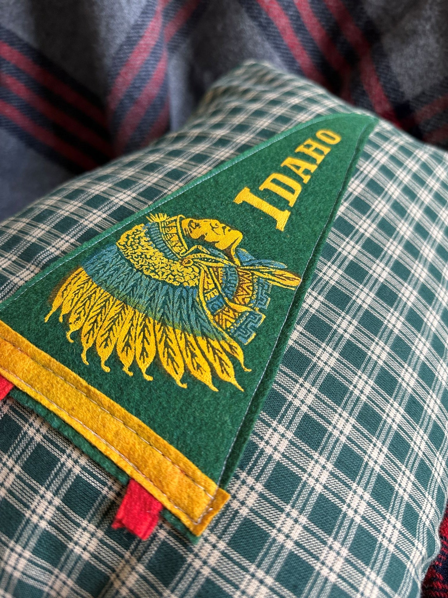 Choose from two fabrics for these two great vintage finds. Each Sold Separately. One has been sewn with new green plaid woven cotton fabric used to create this throw pillow featuring a vintage Idaho Native American green pennant sewn in place. The other vintage pennant has been sewn into a pillow using green and blue plaid fabric. See images for details.