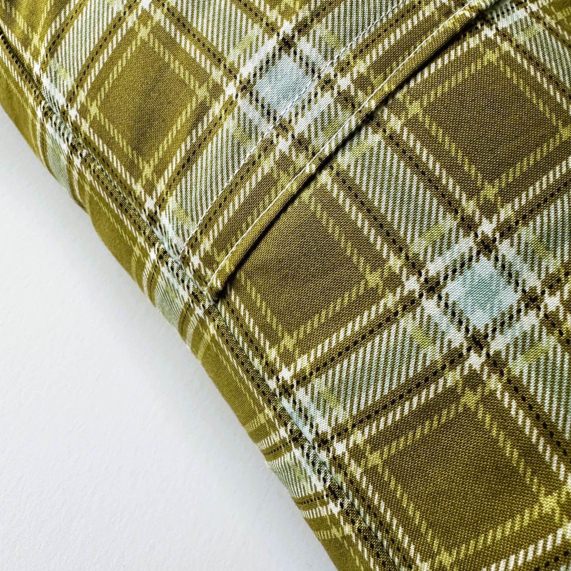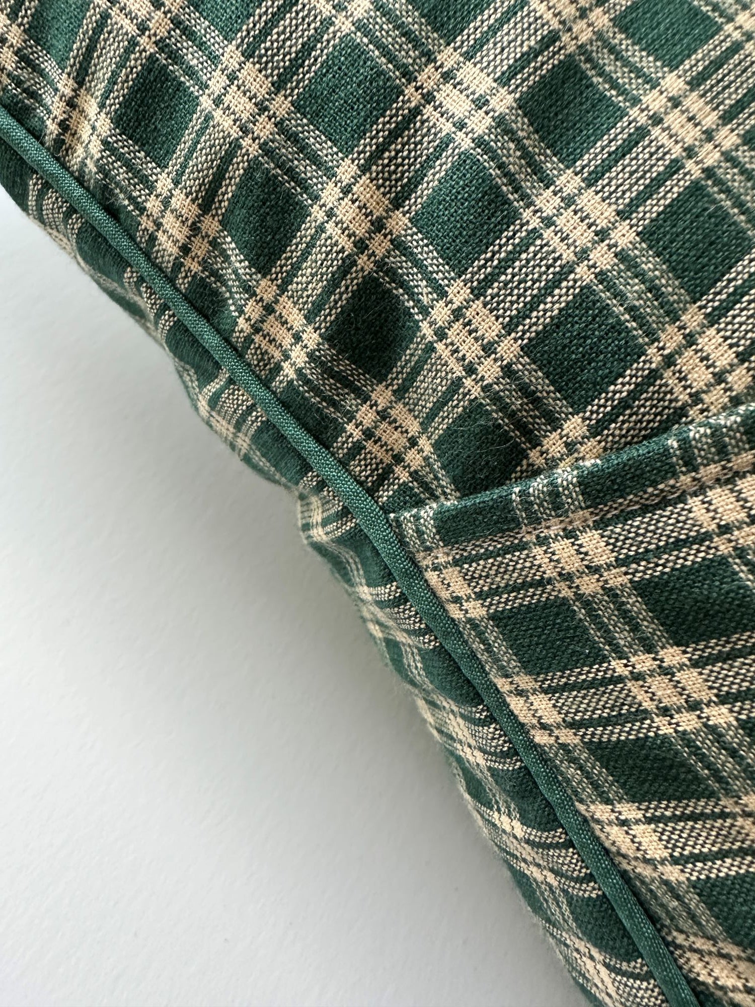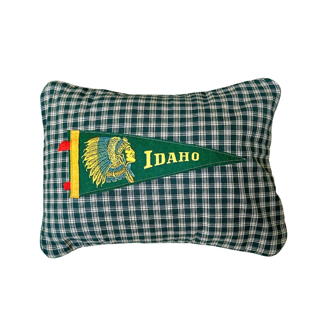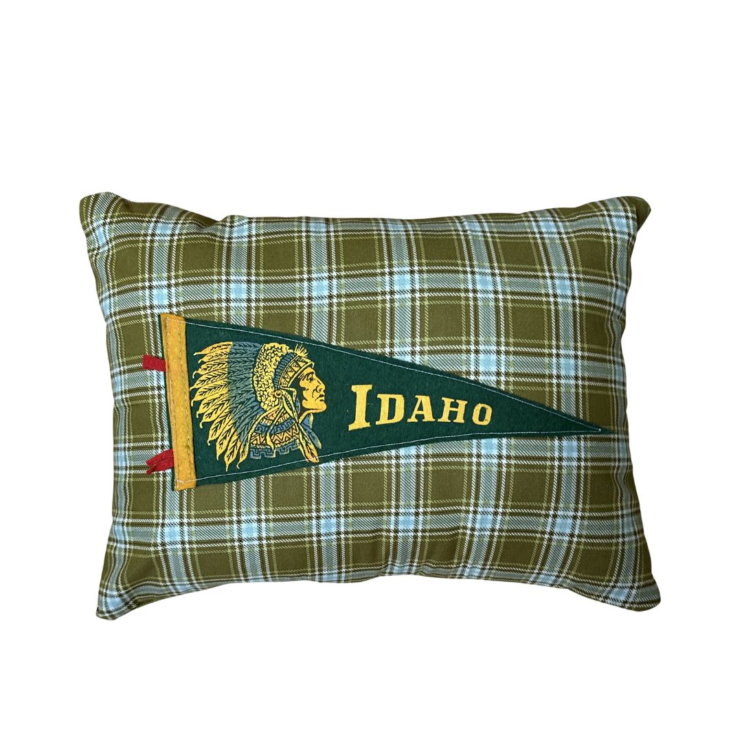 Choose from two fabrics for these two great vintage finds. Each Sold Separately. One has been sewn with new green plaid woven cotton fabric used to create this throw pillow featuring a vintage Idaho Native American green pennant sewn in place. The other vintage pennant has been sewn into a pillow using green and blue plaid fabric. See images for details.