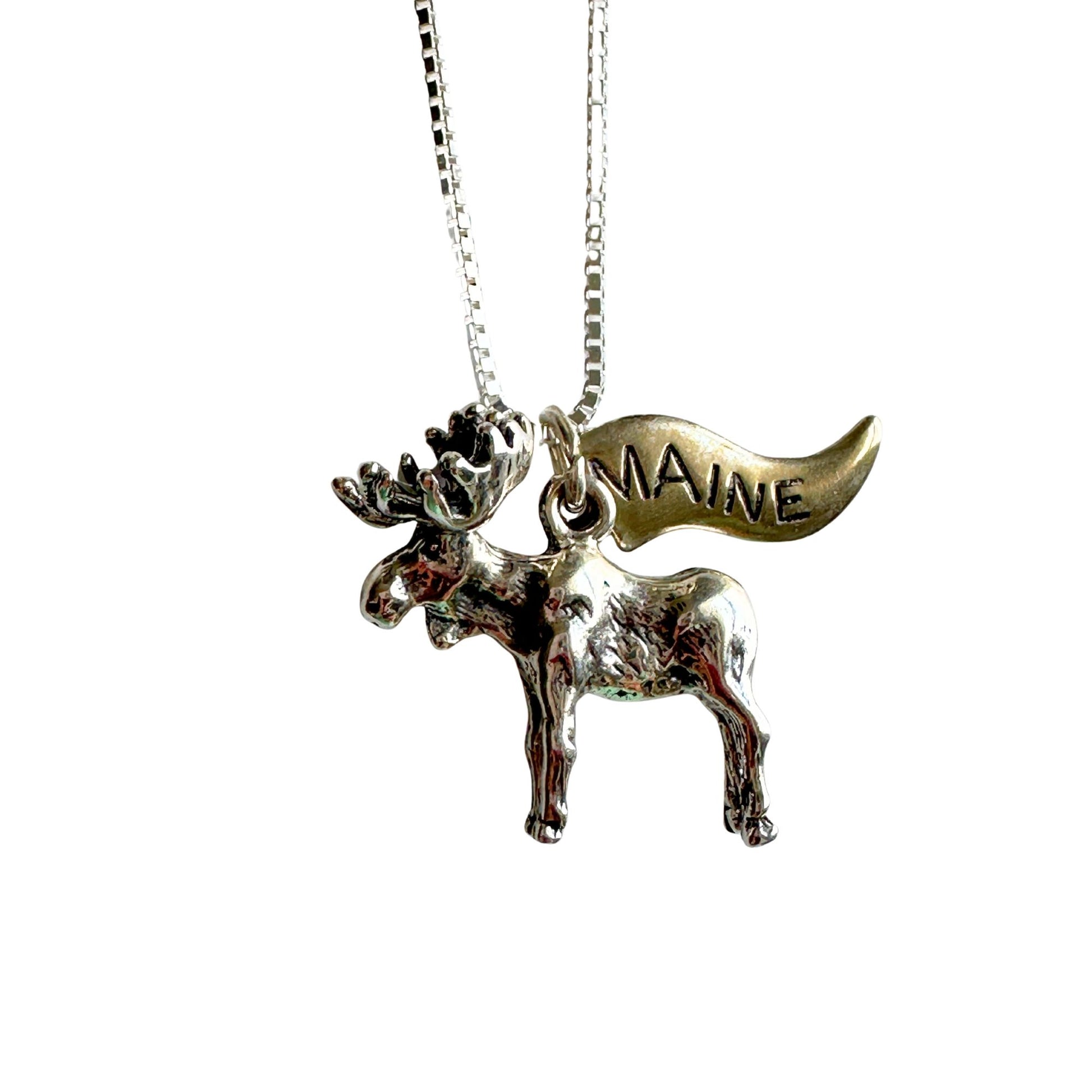 Maine Vintage Sterling Silver charm features a moose and engraved tiny Maine Pennant, on a new 18 inch Sterling Silver necklace with lobster clasp. Date of this specific vintage charm unknown.