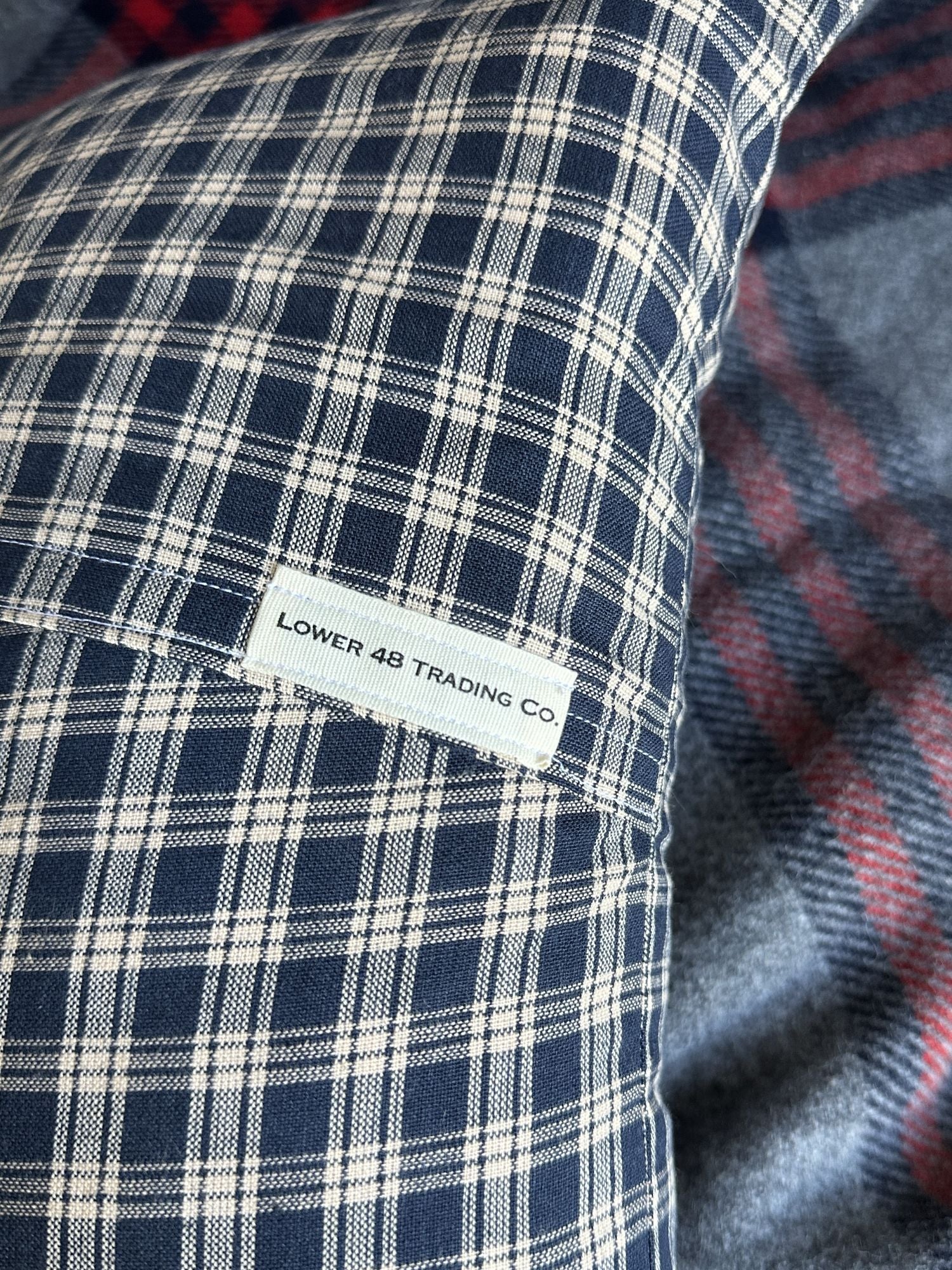 New navy plaid woven cotton fabric used to create this throw pillow featuring a vintage Virginia City, Montana red pennant sewn in place.