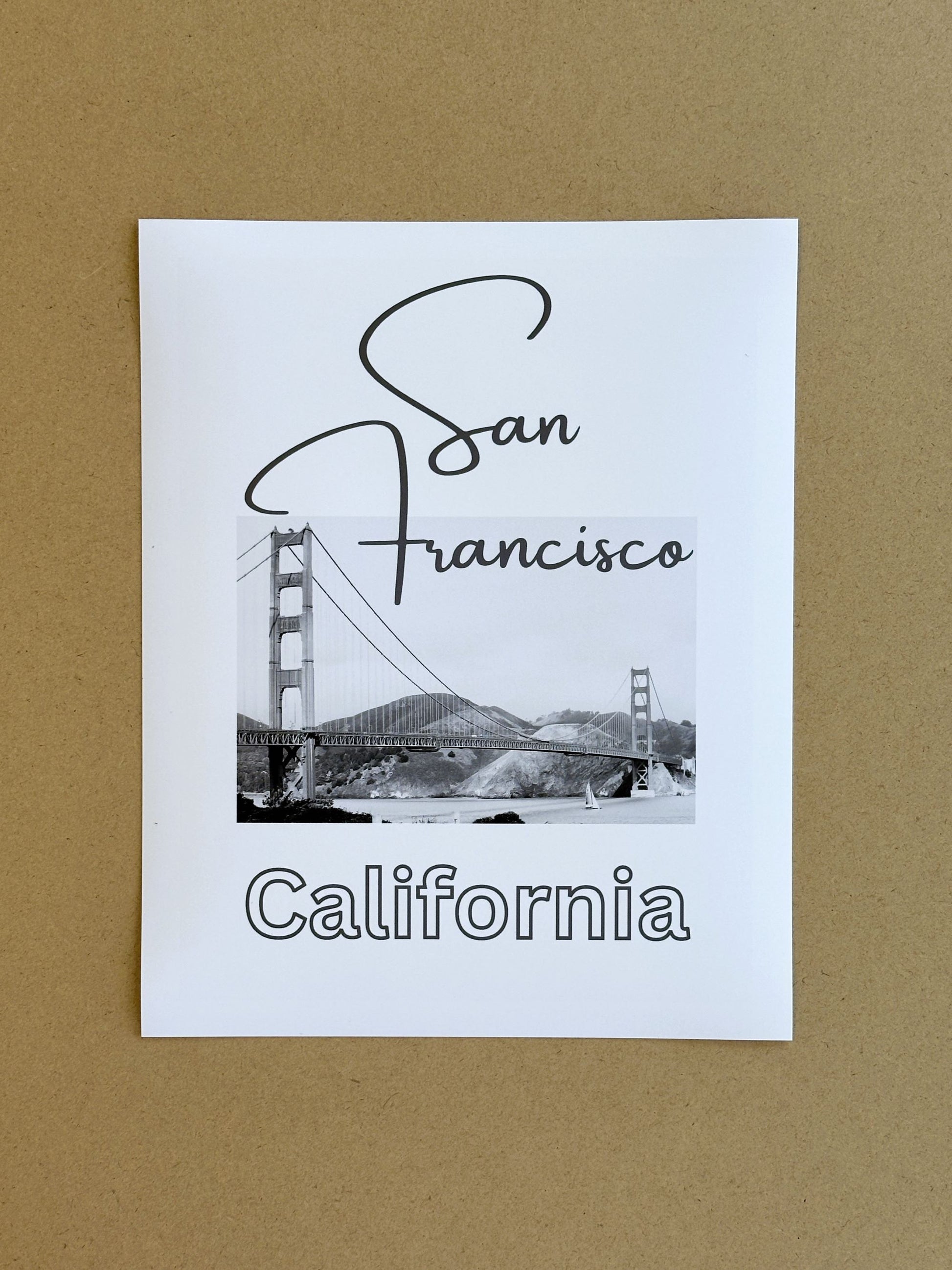 San Francisco Golden Gate Bridge, California is pictured with white border on this beautiful Giclee art print on 8x10 deep matte archival paper. Ready to frame. Photography & Design by Nikki Degn, Lower 48 Trading Company ©