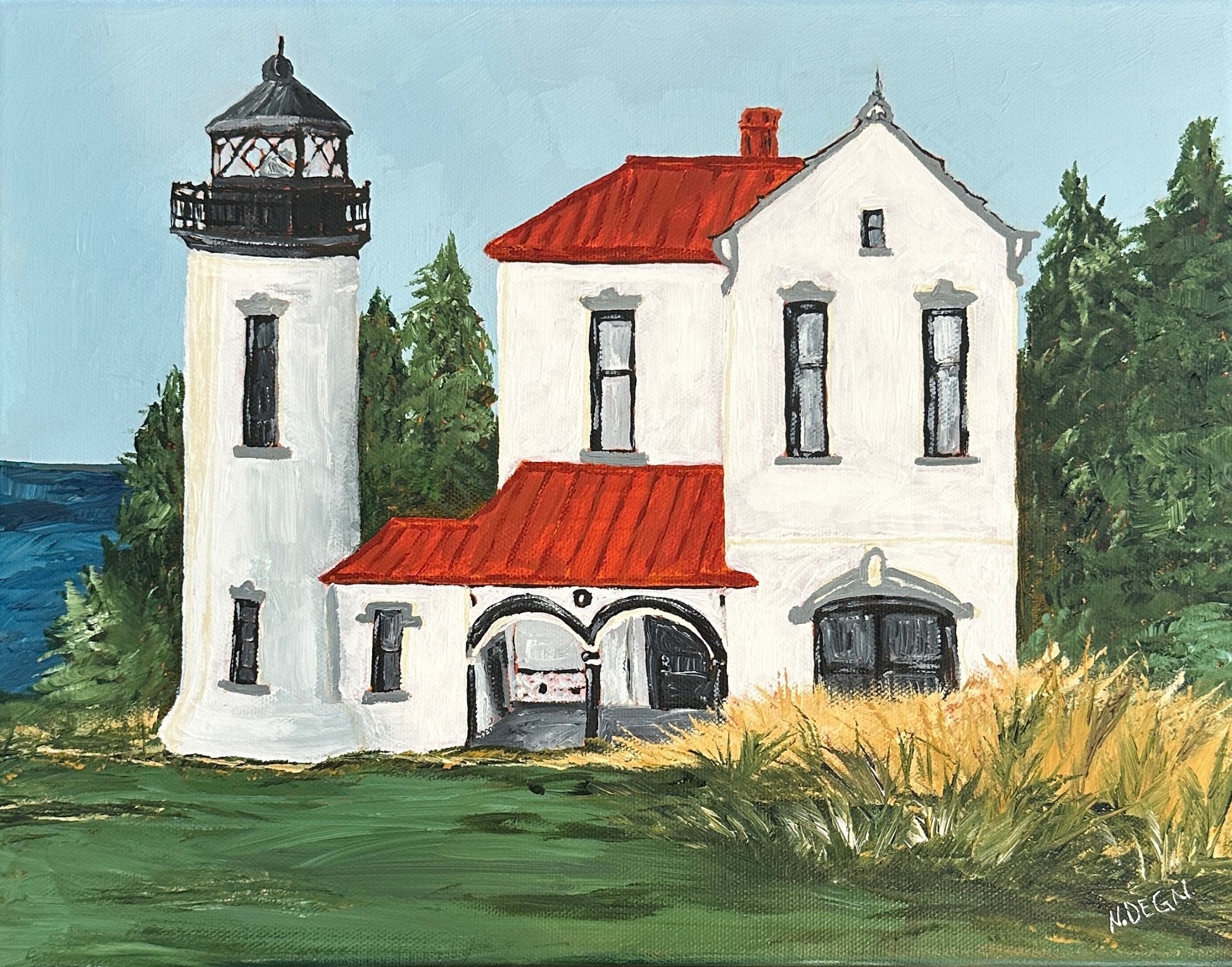 The Admiralty Head Lighthouse on Whidbey Island in Coupeville, Washington at Fort Casey State Park, painting by Nikki Degn. Giclee art print on 8x10 deep matte archival paper. Ready to frame. Art & Design by Nikki Degn, Lower 48 Trading Company ©